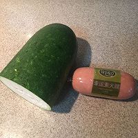 1. 准备材料:冬瓜和素火腿。素火腿是用大豆蛋白等素食材料制作的仿肉火腿,有肉的味道但不是肉食,在网上可以买到。我今天用了半个冬瓜(因为这个冬瓜比较小,大个的可以用四分之一个),和半个素火腿。